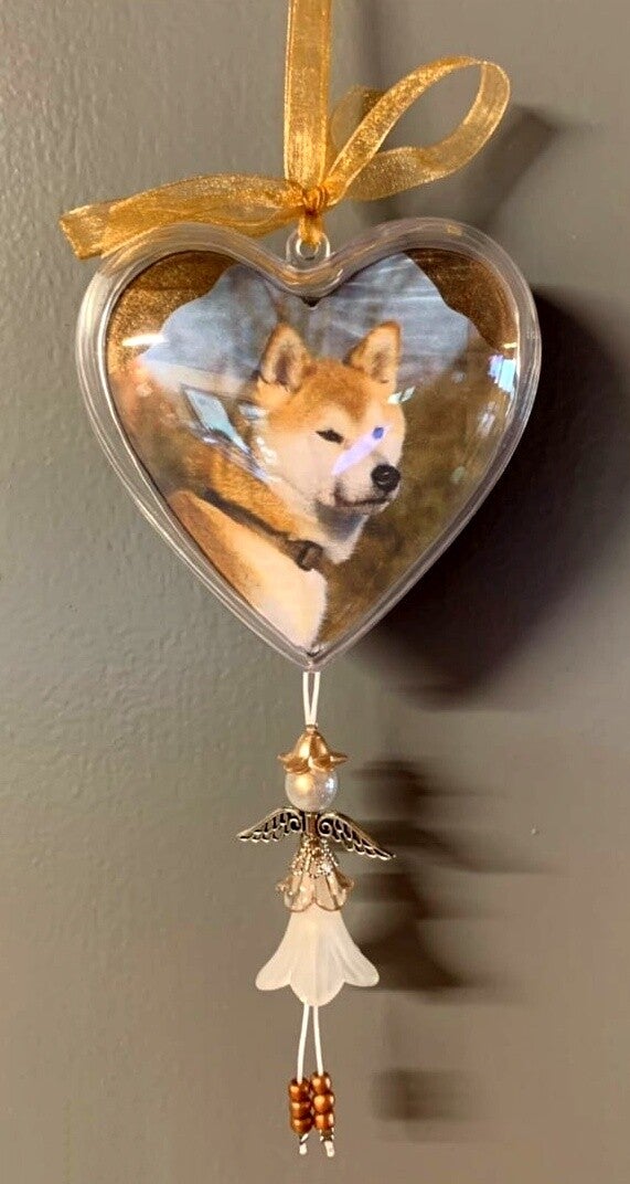 Het fotohart wordt verder gepersonaliseerd met een engeltje en naam of woord naar keuze, zorgvuldig uitgekozen kralen en een mooi lint in bijpassende kleuren. Zo wordt elke creatie écht uniek en helemaal afgestemd op jouw wensen.