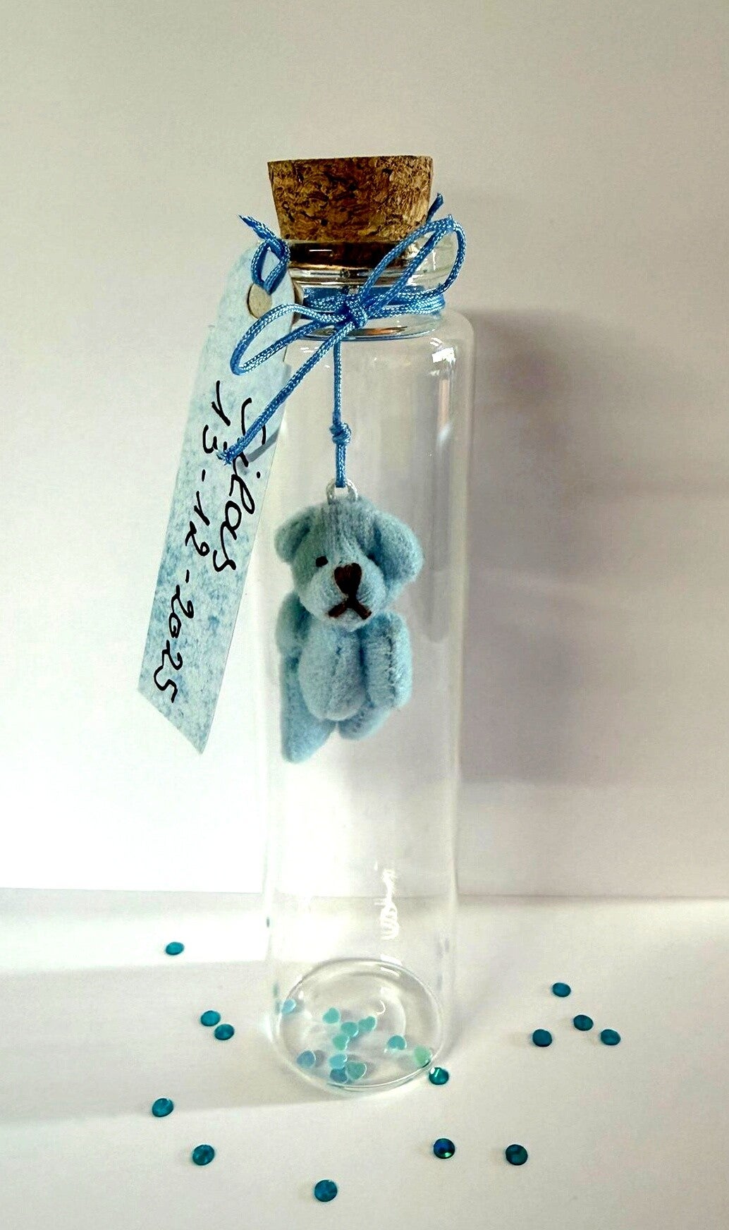 Het flesje is afgesloten met een natuurlijke kurk en afgewerkt met een fijn koordje en wordt volledig gepersonaliseerd met foto, bedel, naam, sterretjes, floating charm, of hoe dat jij het wil. Dit flesje is 12 cm hoog, en het is prachtig om als geschenkje te geven bij de geboorte