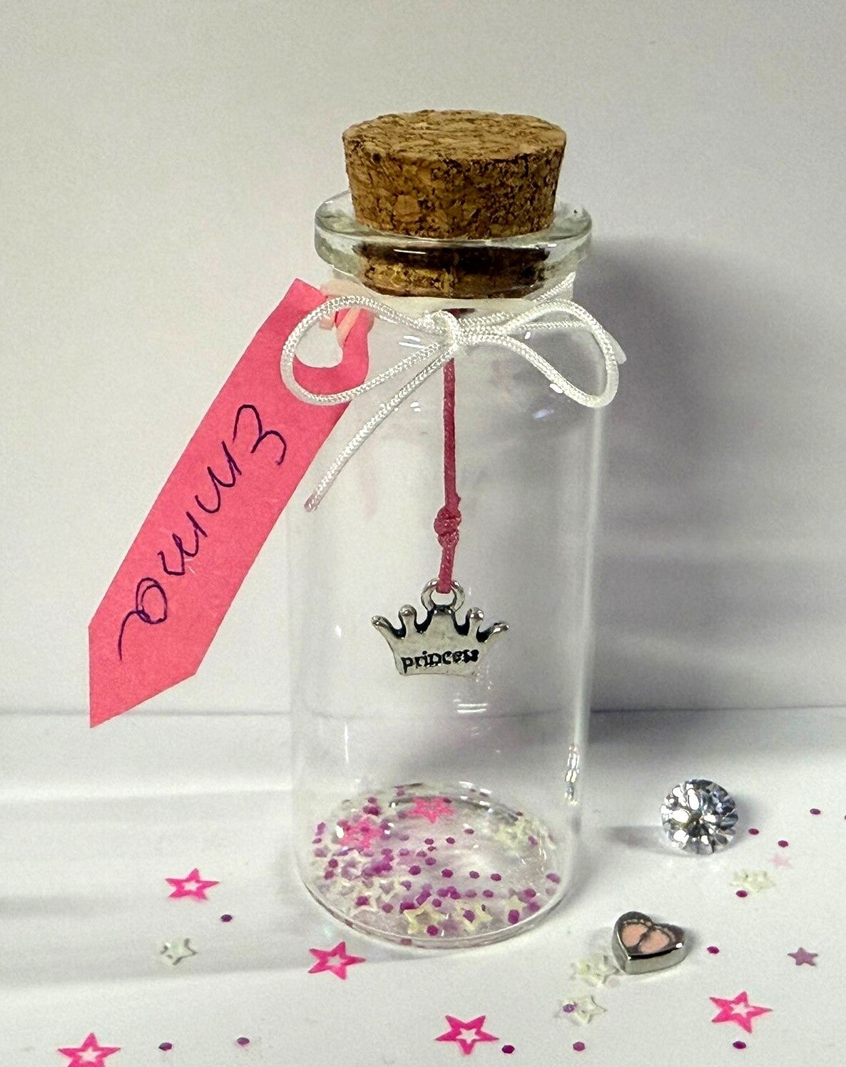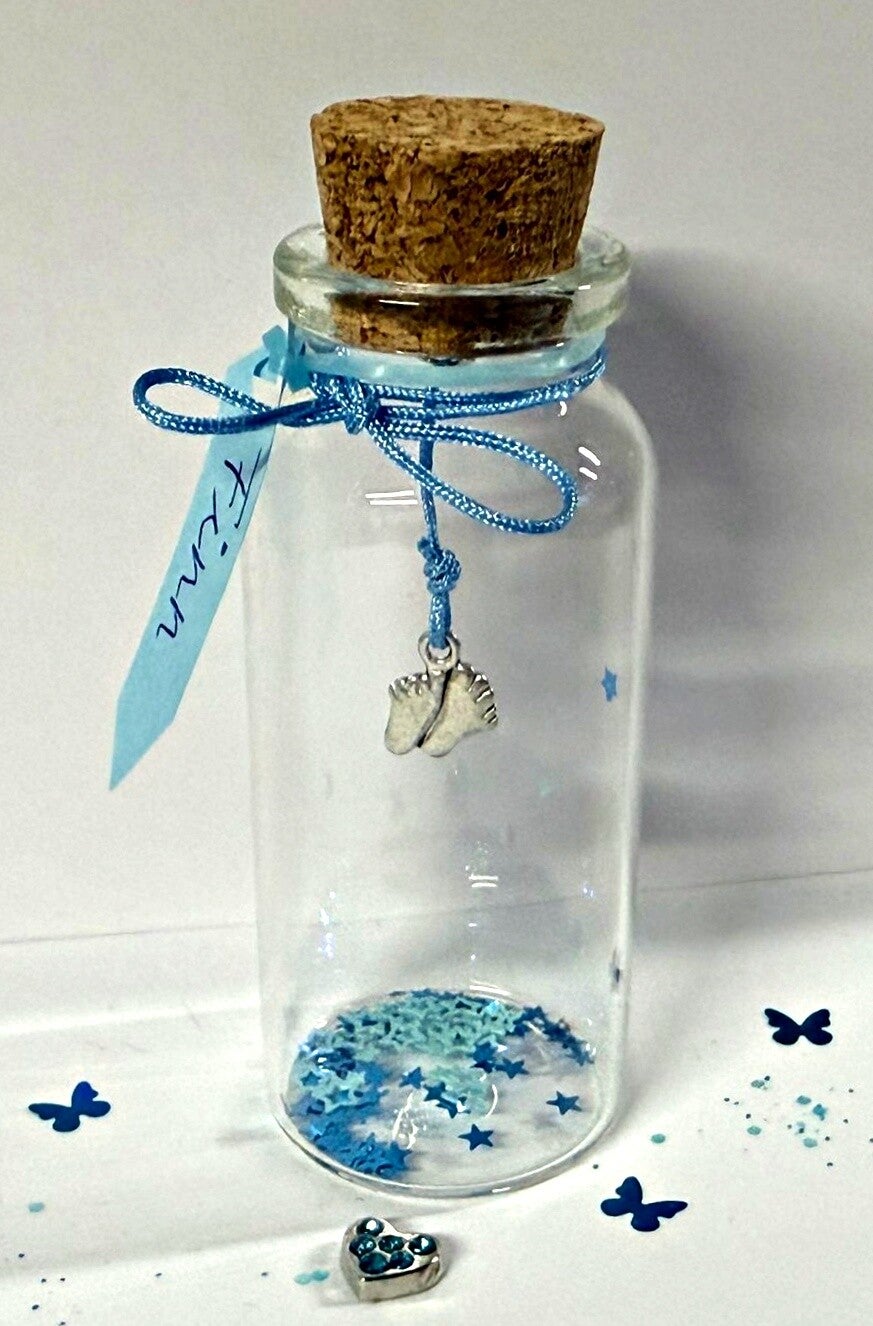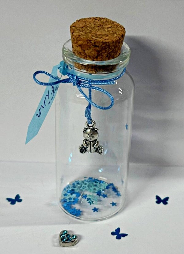 Het flesje is afgesloten met een natuurlijke kurk en afgewerkt met een fijn koordje en wordt volledig gepersonaliseerd met foto, bedel, naam, sterretjes, floating charm, of hoe dat jij het wil. Dit flesje is 7 cm hoog, en het is prachtig om als geschenkje te geven bij de geboorte