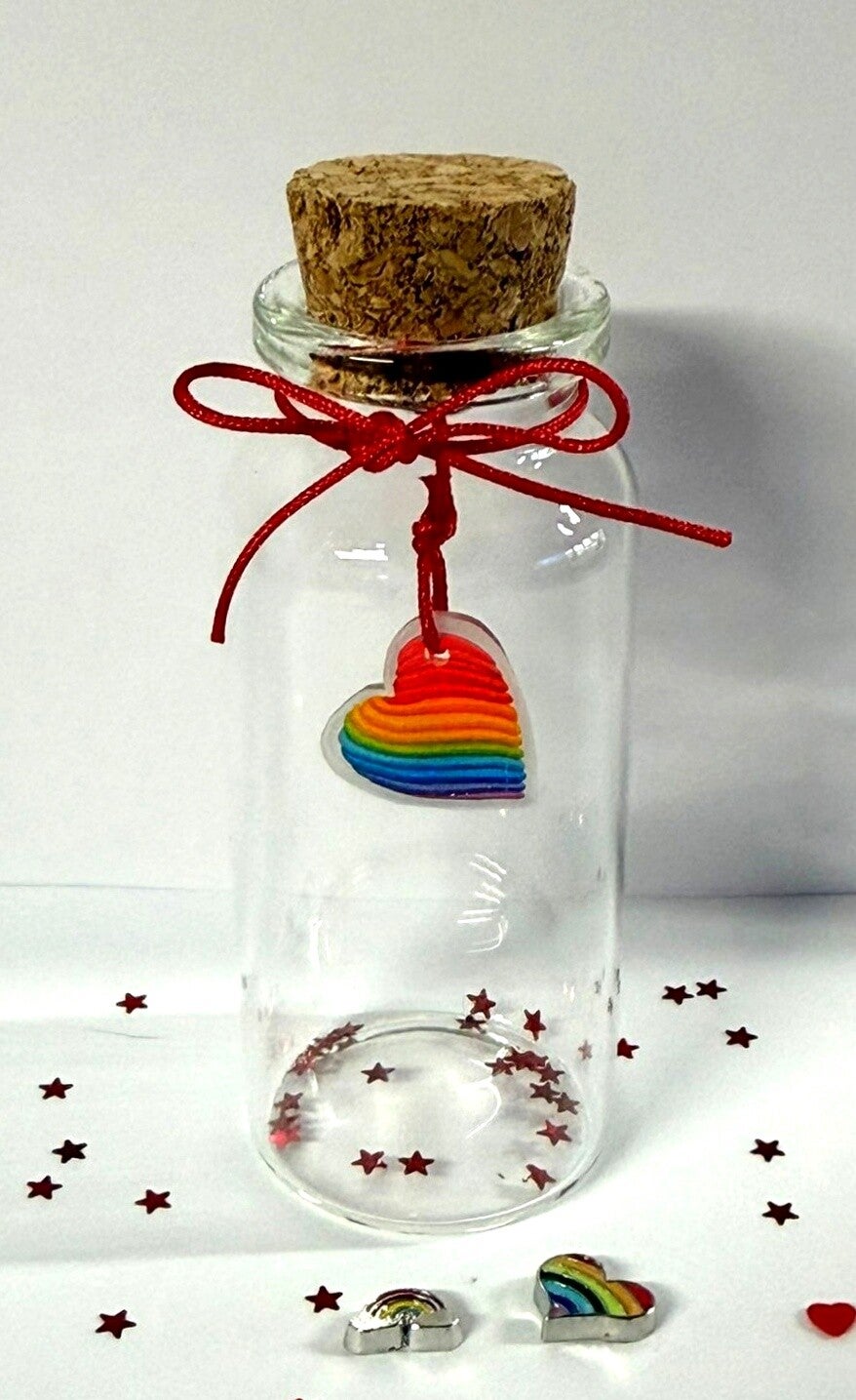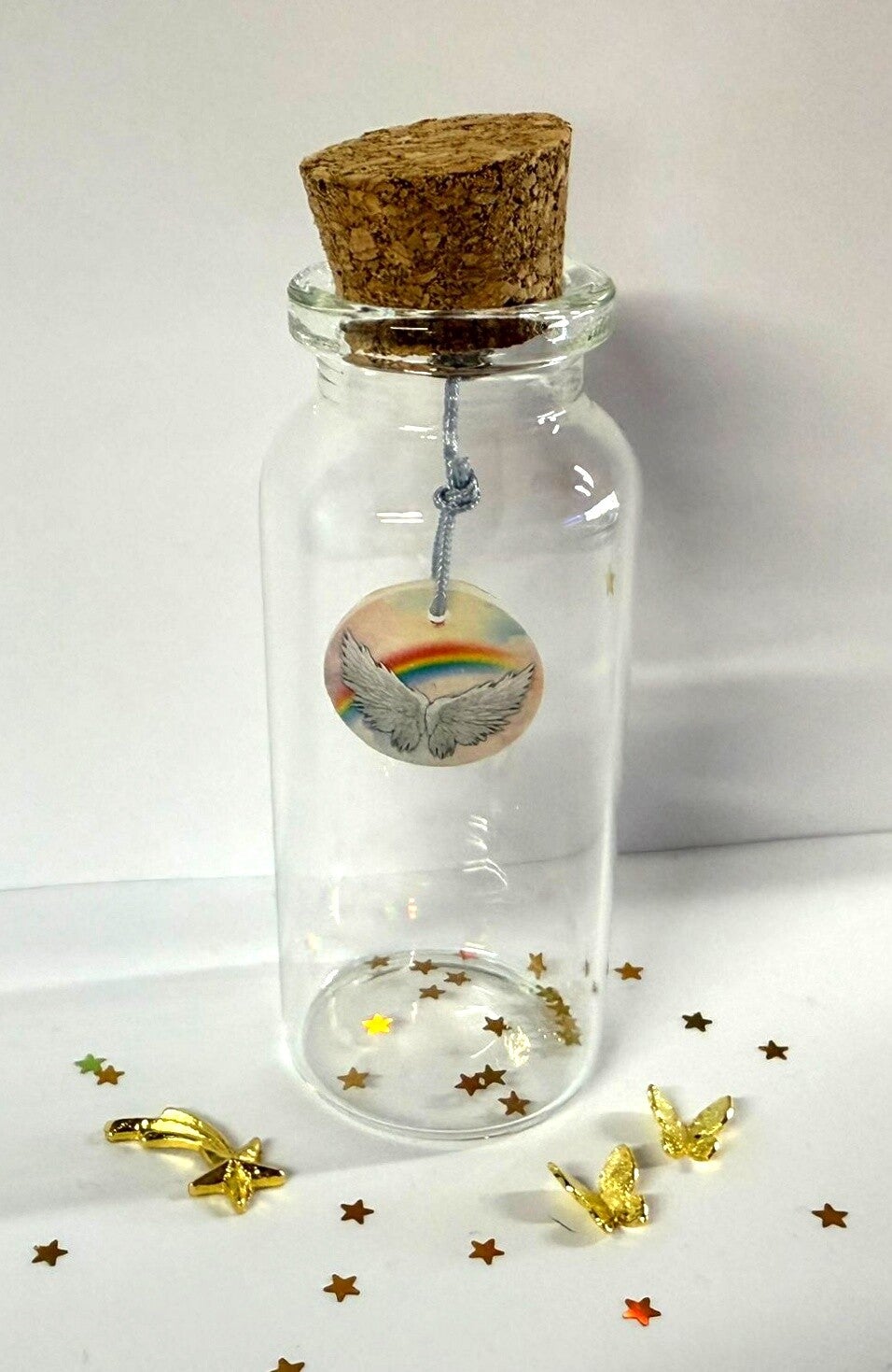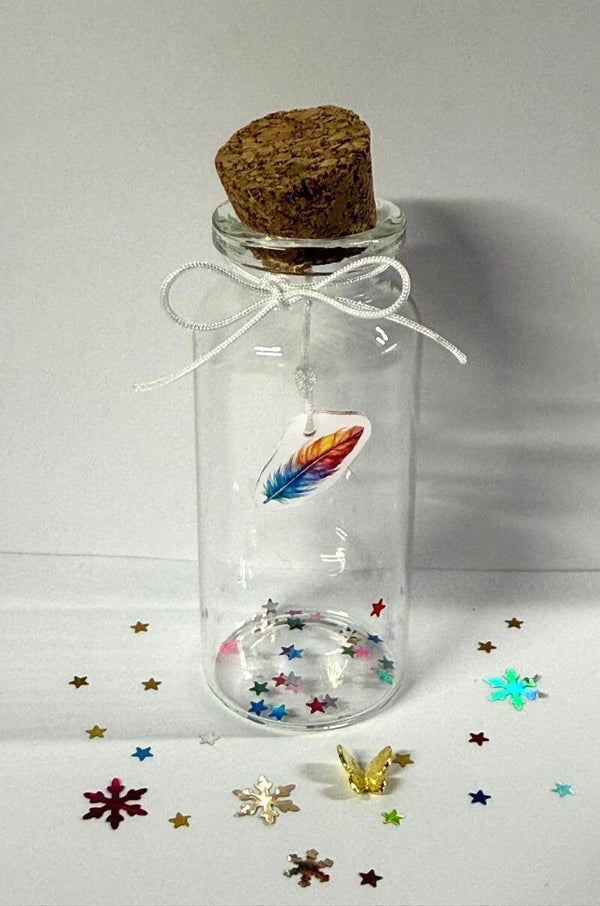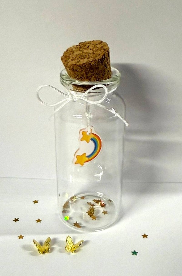 Een persoonlijk en liefdevol memoryflesje om een dierbare herinnering te bewaren. In dit glazen flesje kunnen bijvoorbeeld haartjes, as, of een ander kostbaar aandenken in worden bewaard. Het flesje wordt afgewerkt met een regenboog, sterretjes, strikje, floating charms naar keuze.