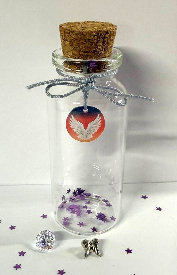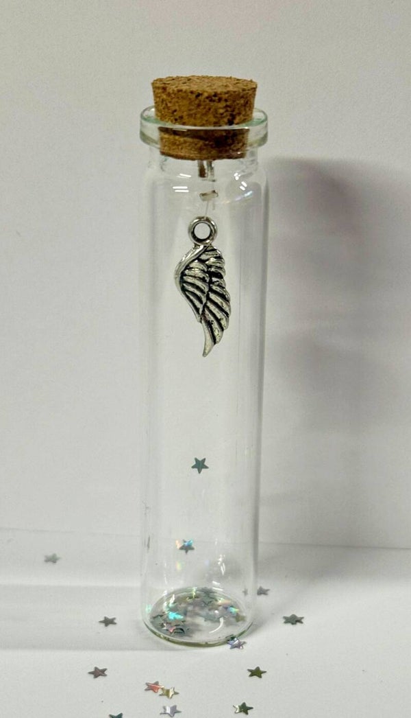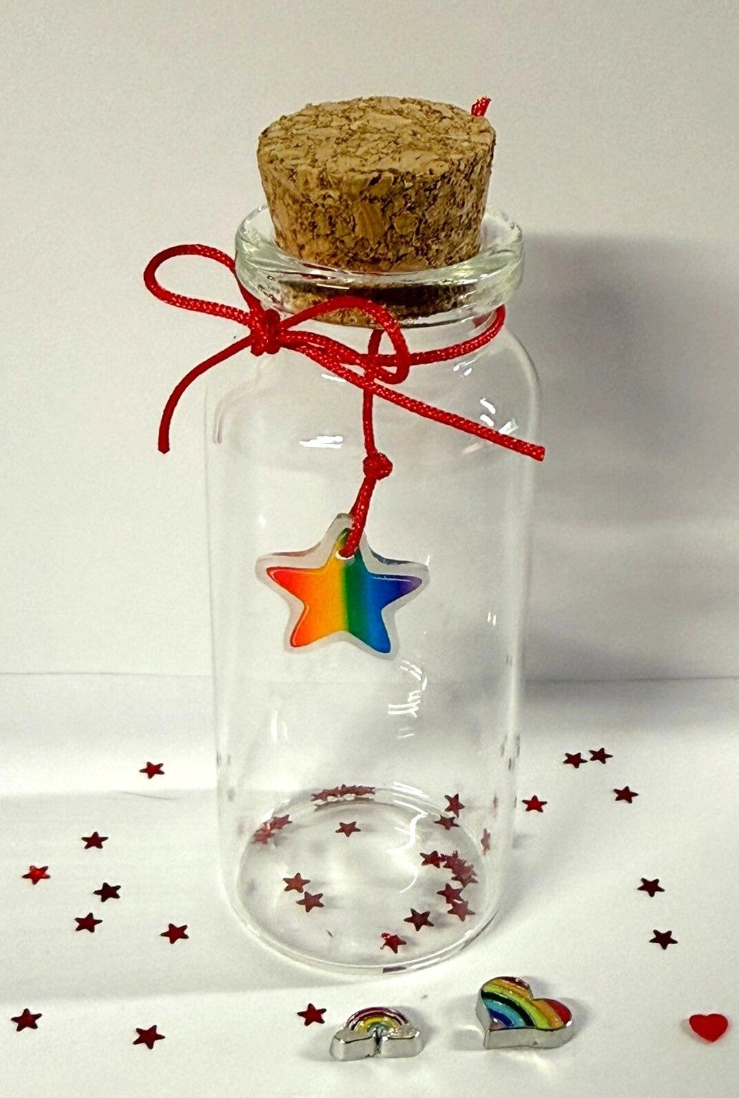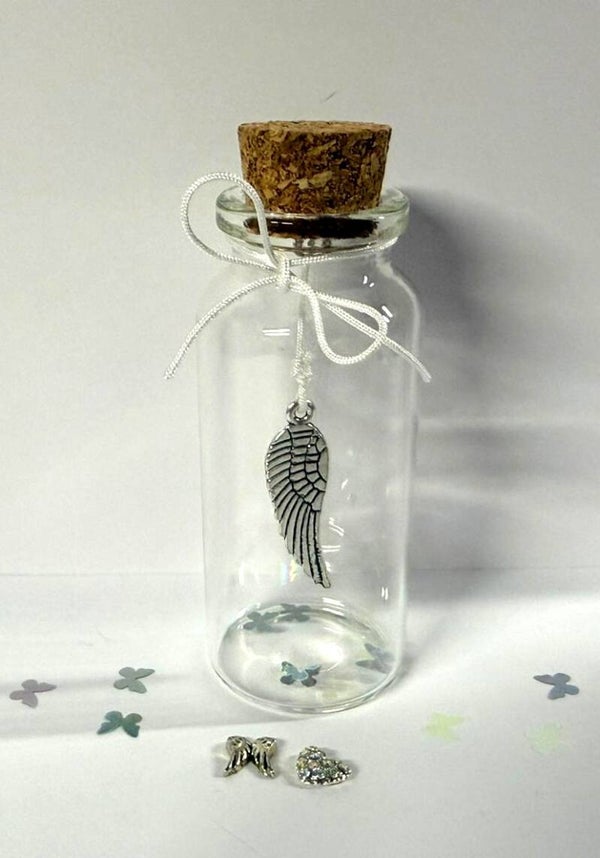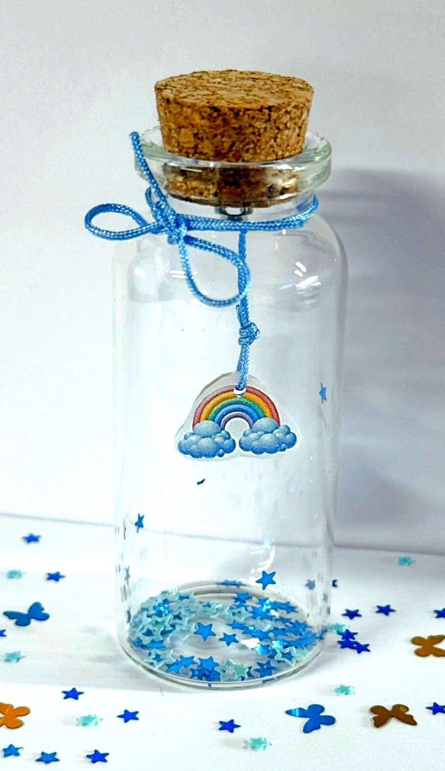 Een persoonlijk en liefdevol memoryflesje om een dierbare herinnering te bewaren. In dit glazen flesje kunnen bijvoorbeeld haartjes, as, of een ander kostbaar aandenken in worden bewaard. Het flesje wordt afgewerkt met een regenboog, sterretjes, strikje, floating charms naar keuze.